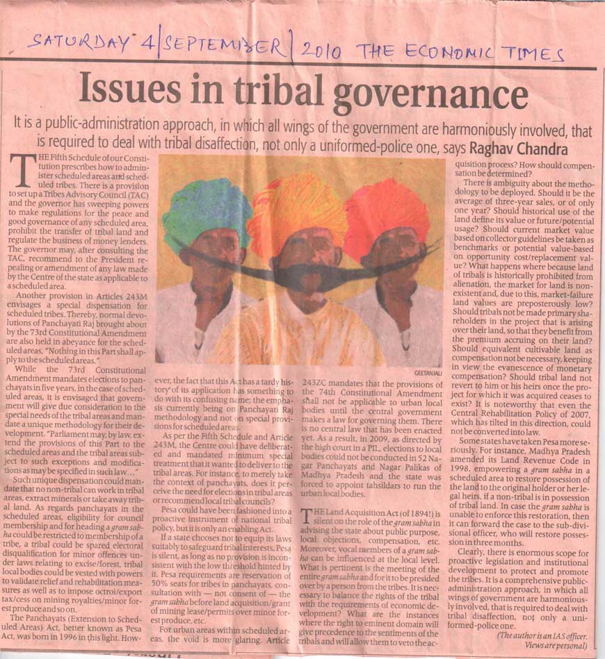 Issues in tribal governance : The Economic Times, 4th Sep. 2010