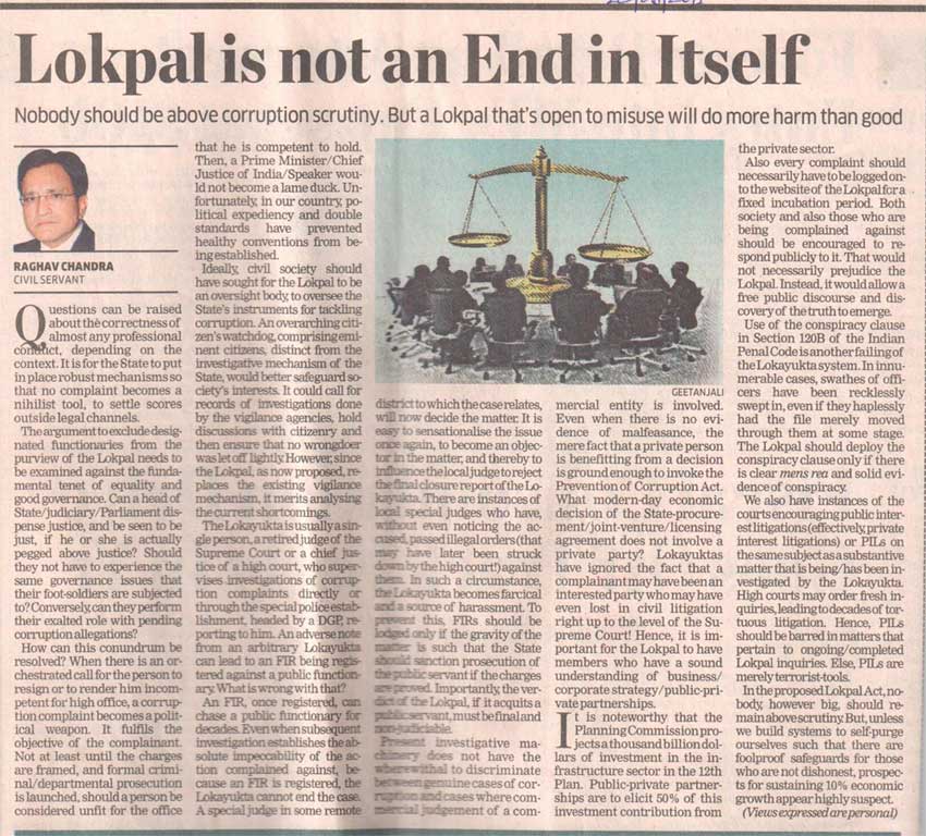 A Lokpal that is open to misuse will do more harm than good” Economic Times June 28, 2011